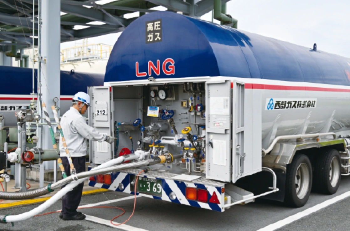 LNGはひびきLNG基地等にてローリ車へ充填され、大牟田工場に輸送されます。なお、液体であるLNGの体積は気体の時の600分の1であり、効率的に輸送できます。