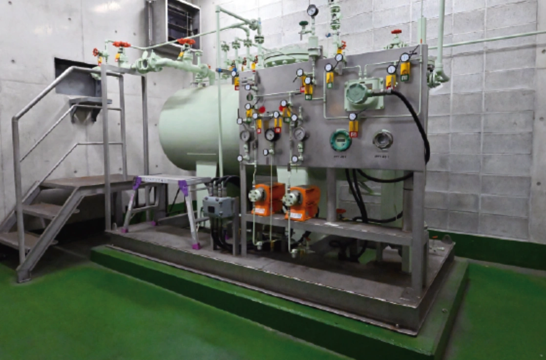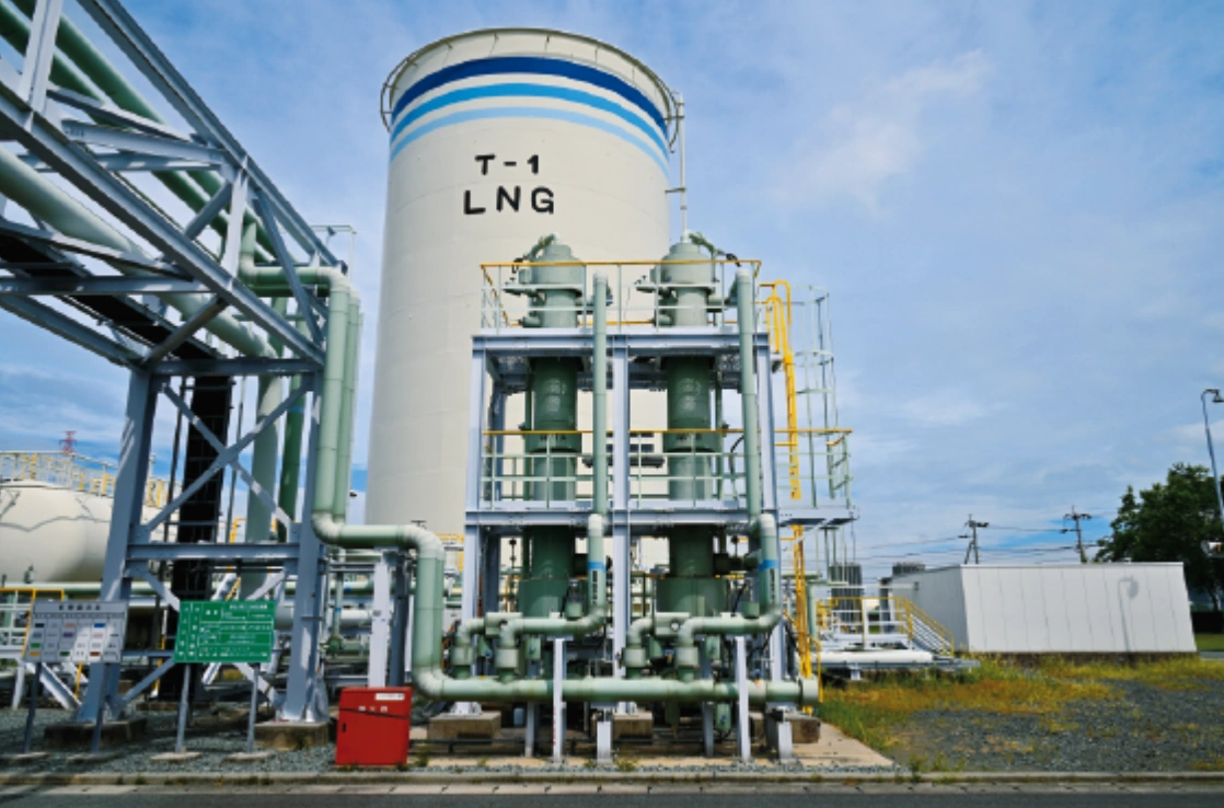 LNGは貯槽からポンプで気化器に送られます。ボイラーで作られた温水を用いて温められ、気化(液体から気体へ変化)させ天然ガスへ戻します。その後、熱量調整装置へ送られます。