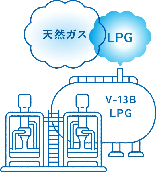 LNG気化器で気化した天然ガスは、熱量調整装置でLPG(ブタン)と混合され、安定した熱量に調整することで、お客さまに供給する都市ガス(13A)になります。